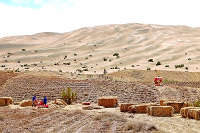 近年來,莫高窟已經(jīng)逐漸形成風(fēng)沙危害綜合防護(hù)體系,有效減輕了風(fēng)沙對石窟的影響。圖為7月23日,在莫高窟的崖頂上,工作人員正在鋪設(shè)草方格固沙。