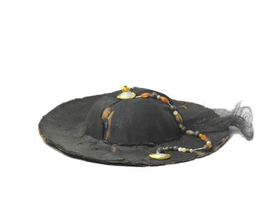 這一頂鑲寶石鈸笠帽,可要豪華貴重得多,這是一頂帽頂垂有一串玉石珠串飾的帽子,帽的直徑有35厘米。《大元典章》曾記載有人搶走蔡國祥懸有紅瑪瑙珠串的棕帽的事。可見帽上垂串飾也是元代貴族的風(fēng)氣。這種帽子的流行始于元成宗大德年間(1297—1307),一個商人賣給官府一塊紅剌子(紅寶石)重一兩三錢,用于鑲嵌帽頂。從此以后,歷代皇帝相承。凡元旦及天壽節(jié)大朝賀時都戴這種鈸笠帽。漳縣元代汪世顯墓出土的這頂鈸笠帽,帽頂鑲金裹玉,由帽頂垂系31顆珠玉組成的串練。以珠玉寶石來裝飾帽子,帽子的價值之高昂自不待言。