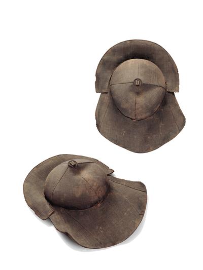 先看前加沿笠帽,大家看是不是有些眼熟?沒錯,這頂帽子與影視劇中英雄俠客們所戴的帽子很相似,《神探狄仁杰》里的李元芳、《水滸》中的林沖外出時就戴類似的帽子。為什么要戴這樣的加沿笠帽呢?為了遮光啊。別小瞧這頂前加沿笠帽,它的背后還有一段歷史故事呢:相傳元世祖忽必烈騎馬射獵時覺得日光太過炫目,聰慧體貼的皇后便為他設(shè)計了這種前面加沿的帽子,戴這種加沿帽遮光效果就好多了,忽必烈非常喜歡,便將這種式樣固定了下來,以后國人紛紛效仿,成為流行款式??墒?,唐宋是在元之前,元芳和林沖似乎不該戴類似的帽子?既是藝術(shù)形象,就不用深究了吧。人類智慧相通,英雄更是惺惺相惜,既都是英雄,戴上同款的帽子也是應(yīng)有之義。