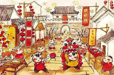 轉眼到了大年三十,俗稱“除夕”,黑河流域除舊迎新的主要活動,都集中在這一天進行。父親一大早就帶我們揭去墻上的舊畫,貼上新買的年畫;窗戶蒙上新紙,貼上母親親手剪的窗花。母親勤勞淳樸心靈手巧,剪出的窗花有“孫猴子摘桃”“孔雀嬉牡丹”,特別是小豬、小狗、小老虎圖案,栩栩如生活靈活現(xiàn)。做完這一切,已經到了晌午時分,父親便急急忙忙帶我們貼春聯(lián)、貼門神。父親說門神是守護門庭的衛(wèi)士,左邊貼“白臉兒”,右邊貼“黑臉兒”,象征財源廣進家道平安。我們將一副秦瓊和尉遲恭的門神,端端正正貼上莊門扇,滿院子紅紅的對聯(lián),滿屋子嶄新的年畫和窗戶上鮮艷的窗花,為節(jié)日披上了盛裝,喜氣洋洋。