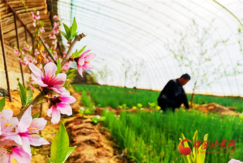 走進(jìn)敦煌市月牙泉鎮(zhèn)現(xiàn)代采摘園區(qū)農(nóng)民陶寶憲的溫室大棚,粉紅的桃花開得正艷,濃濃春意撲面而來(lái),在花香的陪伴下,陶寶憲在大棚中辛勤勞作。