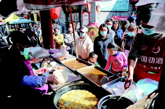3月22日,在崆峒古鎮(zhèn)小吃一條街購買小吃的游客排起了長隊。記者 姚志強 攝