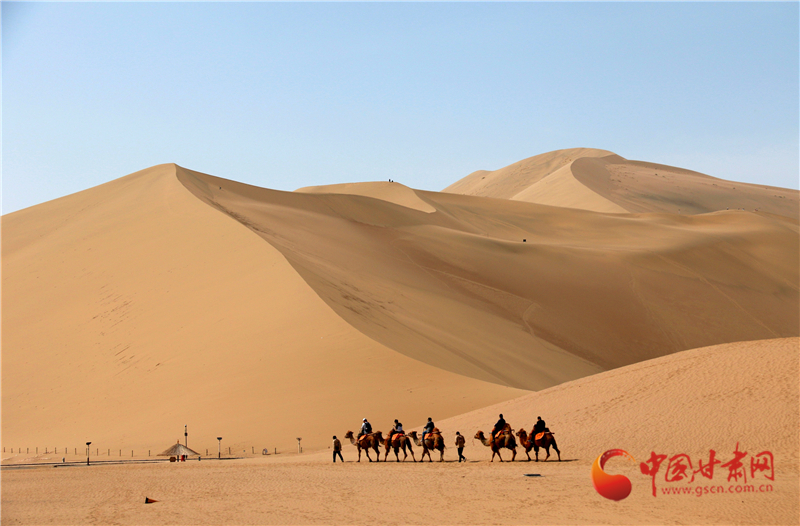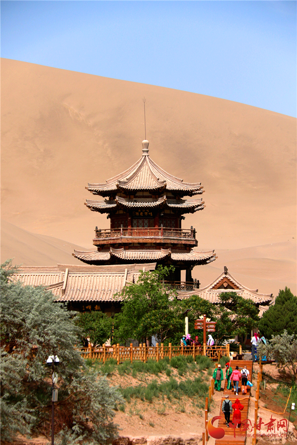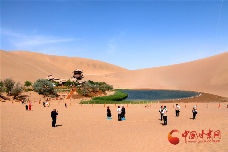 5月19日,游客在甘肅省敦煌市鳴沙山月牙泉景區(qū)游覽。