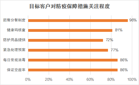 在旅游運(yùn)營商選擇方面,區(qū)別于以往的“先看價格,再看服務(wù)”,客戶更關(guān)注“是否提供防疫保障,能否有效落實(shí)”。九成以上客戶表示,旅游過程中團(tuán)餐應(yīng)嚴(yán)格采用分餐制度,最大化保障用餐安全;八成以上客戶認(rèn)為,需要嚴(yán)控旅游大巴空座率、做好日常消毒工作。