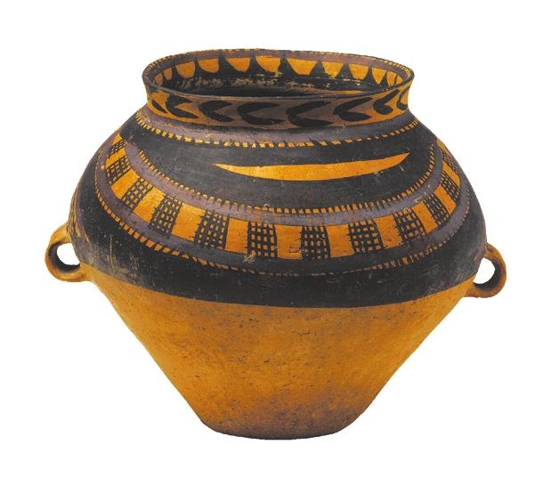 馬家窯文化半山類型(距今約 4500 年),廣河縣地巴坪出土。這是雙耳甕器型大氣貴重,施以紅、黑二彩,紅、黑彩交替使用,腹部繪多層連續(xù)垂弧紋和鋸齒紋,黑、紅彩交替使用,由三組分層連續(xù)的垂弧紋組成整體圖案,每層由兩層黑色帶紋和一層紅色帶紋組成,黑色帶紋上緣繪向上的鋸齒紋。整個(gè)圖案密集繁復(fù),俯視猶如一朵盛開(kāi)的鮮花,造型豐滿,色彩鮮艷。