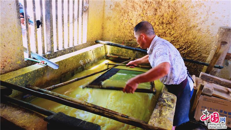 隆回縣灘頭鎮(zhèn)桃林村手工抄紙作坊,已經(jīng)成為一處著名的文旅項(xiàng)目景點(diǎn)。走進(jìn)陶林村,一棟棟青瓦石墻的新屋吸引了人們的目光。屋外山坡竹林茂密,山溪流水潺潺,屋內(nèi)手工抄紙制作的原料、工具布置的次序井然,手工抄紙的全套工藝流程在這幾棟屋中得以完整體現(xiàn)。手工抄紙技術(shù)歷史悠久,始于隋唐,至明朝時抄紙已經(jīng)非常盛行。上世紀(jì)八十年代鼎盛時還曾遠(yuǎn)銷東南亞和日本。非遺傳承人李志軍今年61歲,自稱“紙蟲”,帶領(lǐng)著全家人承襲著祖宗留下的獨(dú)特技藝。而支撐著李志軍的堅(jiān)守的,是隆回縣文旅部門的巨大付出和努力。2011年,他們支持李志軍建立了手工抄紙標(biāo)準(zhǔn)化作坊,2016年又對該作坊進(jìn)行擴(kuò)建,使之成為國家級非遺項(xiàng)目。灘頭手工抄紙作坊占地面積1714平方米,是灘頭手工抄紙有史以來最大的作坊,同時也是集生產(chǎn)、創(chuàng)新、傳承、展示、研學(xué)為一體的重要基地和文旅基地。