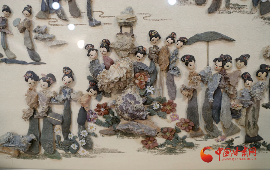 最近,周文露正在創(chuàng)作客戶定制的金陵十二釵圖,這幅風(fēng)雨雕除了人物面部經(jīng)過(guò)人為描繪加工,其他部位以及山水意境等都是戈壁沙石所做。很大程度上,這幅作品就是巧妙地將戈壁沙石創(chuàng)意堆砌達(dá)到畫面效果。