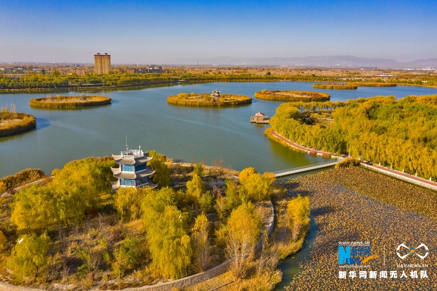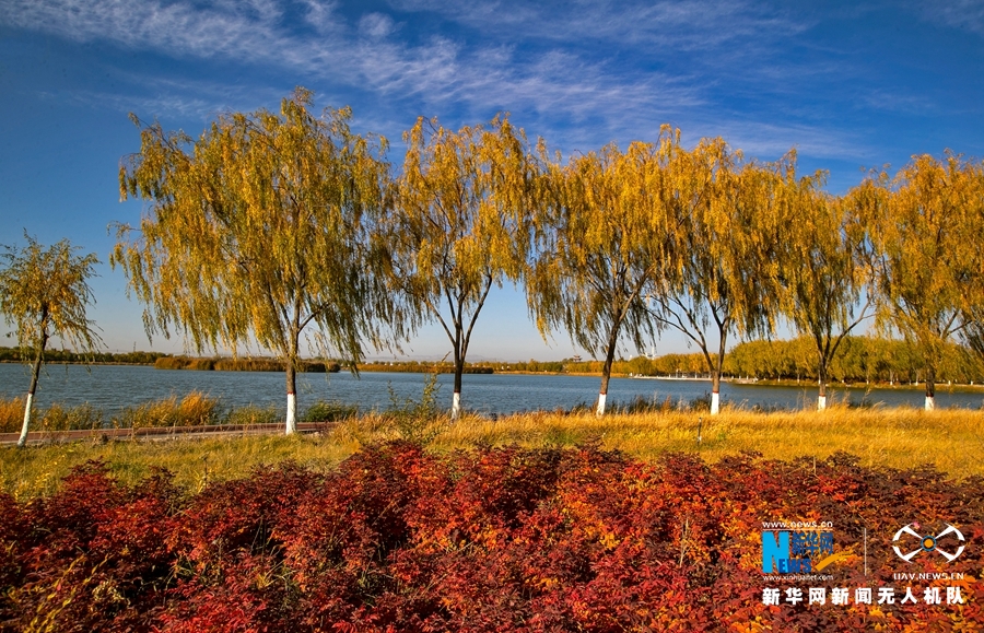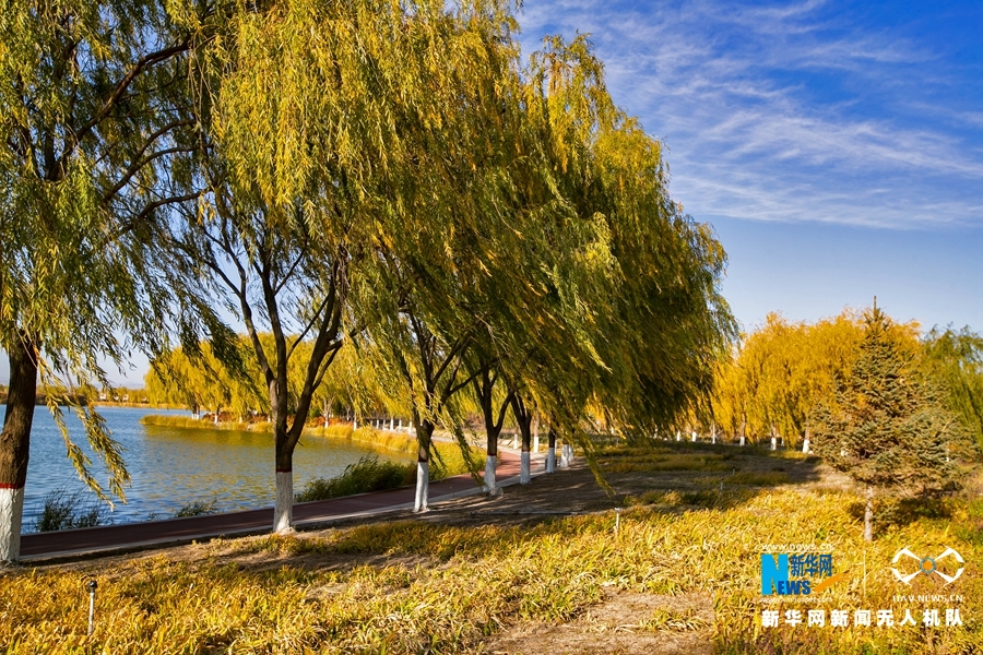 深秋時節(jié),國家4A級景區(qū)甘肅省張掖潤泉湖公園秋水依依,草木金黃,呈現(xiàn)出一幅斑斕畫卷。新華網發(fā)(成林 攝)