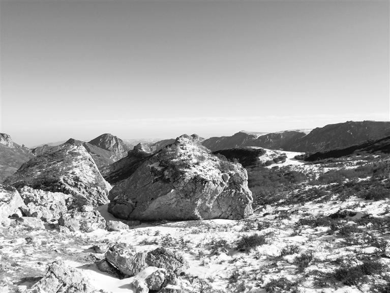 穿過(guò)公路就來(lái)到露骨山腳下,山間灌木叢生,枯葉凋零,一夜的小雪也使天空更加清澈。上山的路,總體是溯溪而上,不過(guò)腳下的小溪已經(jīng)變成冰河,但潺潺水聲不時(shí)在耳邊響起,大小石塊橫亙?cè)诒又?,白雪覆蓋其間,我們一行沿著前人在雪地留下的腳印,撥開(kāi)齊胸的灌木枝,深一腳淺一腳、兜兜轉(zhuǎn)轉(zhuǎn)向前行。