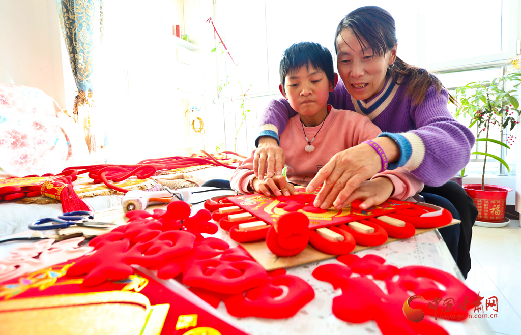 1月6日,甘肅民樂生態(tài)工業(yè)園區(qū)的巾幗扶貧車間內(nèi),女工們正在教授小朋友編織中國結(jié)。