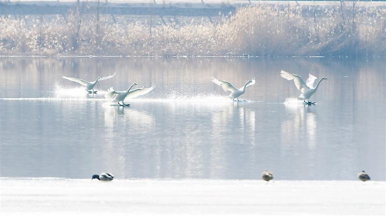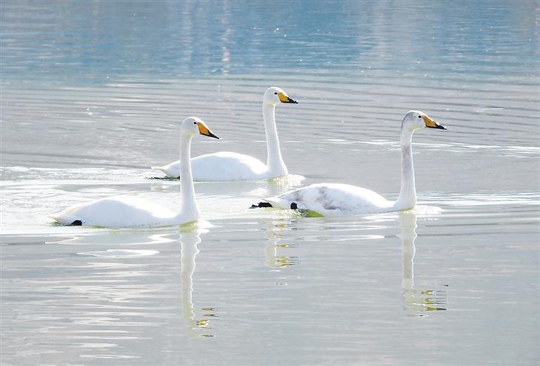 近日,永靖縣鹽鍋峽鎮(zhèn)境內(nèi)的黃河八盤(pán)峽水庫(kù)成為天鵝等候鳥(niǎo)越冬的樂(lè)園,它們?cè)诖藯?、覓食,成為冬日黃河里的一道靚麗風(fēng)景。 本報(bào)記者 史有東 攝