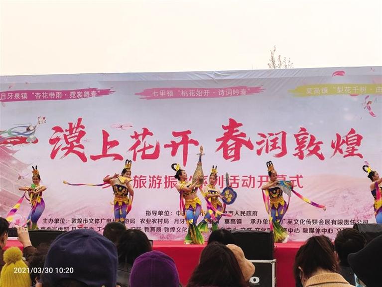 三月的敦煌,春風(fēng)拂面,漠上花開(kāi)。鳴沙山下,十里杏花爭(zhēng)相綻放;黨河兩畔,千畝桃花含苞待放;春風(fēng)蕩漾,早酥梨基地花苞滿枝丫。鮮花以自己的嬌媚打開(kāi)了戈壁大漠的春天。敦煌市將以“春”為韻腳,“花”為主角,開(kāi)展“漠上花開(kāi)·春潤(rùn)敦煌”鄉(xiāng)村旅游振興系列活動(dòng)。包括“杏花帶雨·霓裳舞春”“桃花始開(kāi)·詩(shī)詞吟春”“梨花千樹(shù)·曲藝鬧春”3場(chǎng)主場(chǎng)活動(dòng),以及徒步踏青、康體騎行、研學(xué)體驗(yàn)等5項(xiàng)主題活動(dòng),并將組織開(kāi)展敦煌服走秀、桃花詩(shī)會(huì)、非遺曲子戲表演等多項(xiàng)鄉(xiāng)村旅游特色配套活動(dòng)。