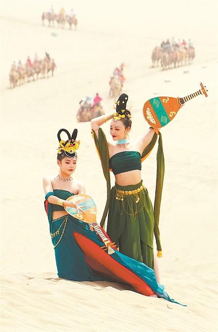 “五一”假期,游客在敦煌鳴沙山月牙泉景區(qū)拍照,該景區(qū)迎來今年旅游高峰。 新甘肅·甘肅日?qǐng)?bào)通訊員 馬曉偉
