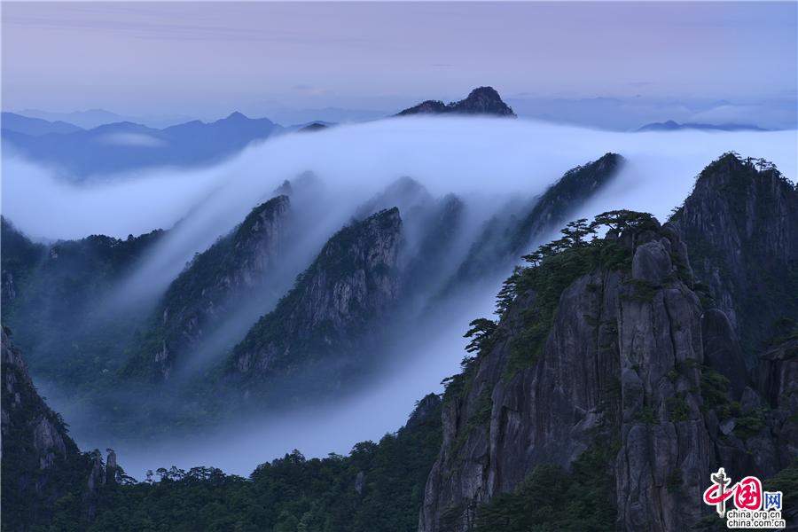 5月22日傍晚,雨后安徽黃山風(fēng)景區(qū)現(xiàn)壯觀的云海奇觀,見(jiàn)云海奔騰而來(lái),越過(guò)北海的始信峰,沿著群峰傾瀉而下勢(shì)如瀑布之壯觀,在奇群、怪石和形態(tài)各異黃山松的作用下勾勒出一幅幅流動(dòng)的水墨畫(huà);黃山不僅是云霧之鄉(xiāng),更是中國(guó)傳統(tǒng)水墨畫(huà)的天然的素材。(姚育青)