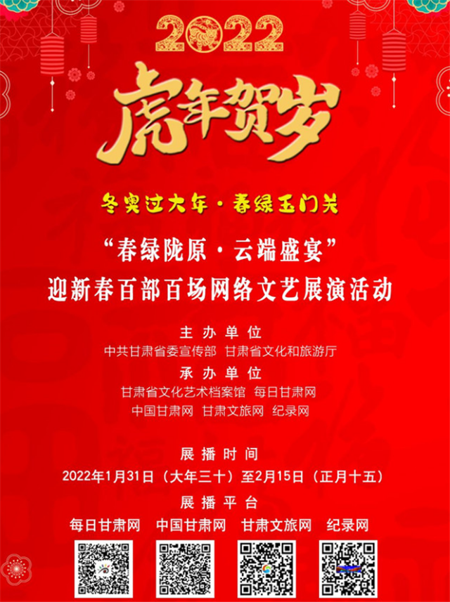 甘肅省博物館在春節(jié)期間舉辦了“虎虎生福——壬寅(虎年)新春生肖文物聯(lián)展”,甘肅省圖書館舉辦7大專題30余項文化體驗活動。在“春之華章”2022年甘肅省電視春節(jié)聯(lián)歡晚會上,原創(chuàng)話劇《八步沙》、隴劇《大禹治水》等精彩上演;甘肅省非遺保護(hù)中心開展了“虎虎有神過大年——如意甘肅·多彩非遺”宣傳推廣活動;甘肅演藝集團通過線上線下結(jié)合方式,開展2022“我們的中國夢”——文化進(jìn)萬家迎新春文藝演出活動;張掖市舉辦春節(jié)“九曲黃河燈陣啟燈納福非遺文化展演”活動。