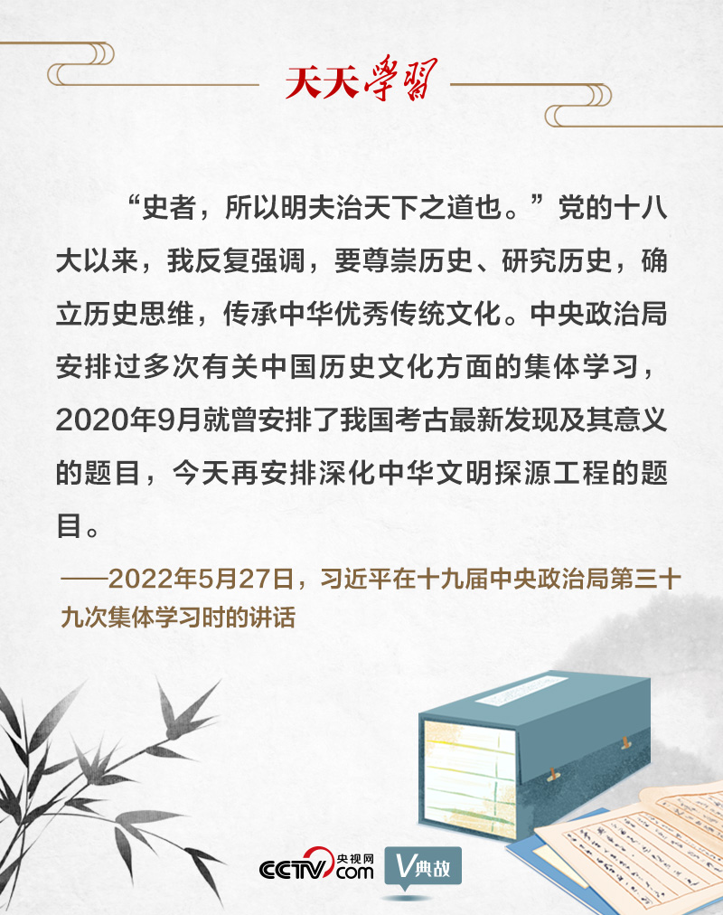 為深入了解中華文明五千多年發(fā)展史,推動把中國文明歷史研究引向深入,推動全黨全社會增強歷史自覺、堅定文化自信,2022年5月27日,十九屆中央政治局就深化中華文明探源工程進行第三十九次集體學(xué)習(xí)。習(xí)近平總書記引用古語“史者,所以明夫治天下之道也”,強調(diào)要尊崇歷史、研究歷史,確立歷史思維,傳承中華優(yōu)秀傳統(tǒng)文化。