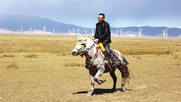 驅(qū)車向草原腹地進(jìn)發(fā),遠(yuǎn)遠(yuǎn)就能看見有人在馴馬。馴馬者房利軍和他的坐騎“尕青”仿佛“人馬合一”,同呼吸、共步調(diào),一遍遍練習(xí),像走,更像飛。這便是傳說中的走馬文化,和跑馬的加速度不同,走馬不管是走還是跑,都是快步勻速,短途速度快,長途耐力強(qiáng),騎乘平穩(wěn),姿態(tài)優(yōu)美,觀賞性強(qiáng)。在牧區(qū),走馬實(shí)用性強(qiáng),深受當(dāng)?shù)厝藲g迎。曾有專家稱,“馬踏飛燕”的“馬”即為走馬。每天,和武威天祝一山之隔的這片草原,都與房利軍有關(guān),在這里,他專心馴馬,而他的500只羊則在一旁撒歡。尤其從高空俯瞰,草原牧羊的畫面甚是壯觀??赐犟Z馬,房利軍騎馬帶路,采訪車沿著馬道回到了“家”。