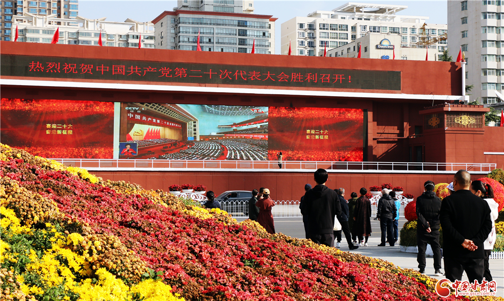 蘭州市東方紅廣場(chǎng),許多市民駐足路邊,通過大屏幕收看中國共產(chǎn)黨第二十次全國代表大會(huì)盛況。