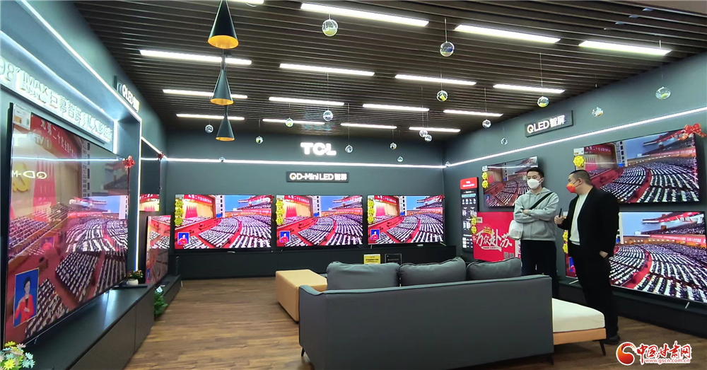 蘭州市西站蘇寧電器賣場(chǎng),電視墻正在直播中國共產(chǎn)黨第二十次全國代表大會(huì)盛況,顧客駐足觀看。