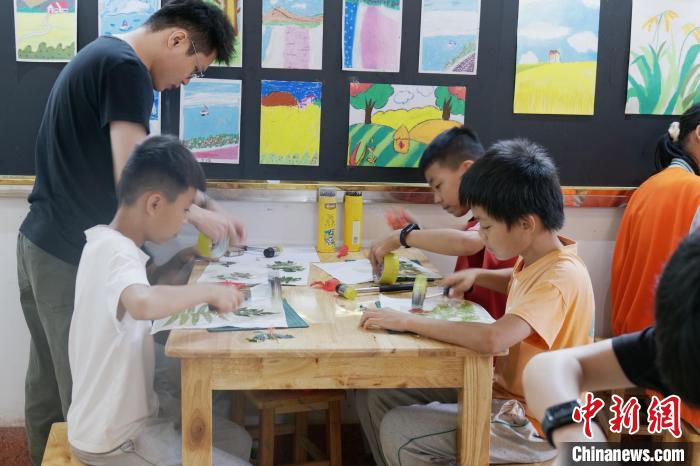 距離村口不遠處的六禾畫社中,傳來一陣“咚咚”的敲擊聲。屋內(nèi),十幾名孩童手拿小錘子,在白色卡紙上拓印葉片的形狀。