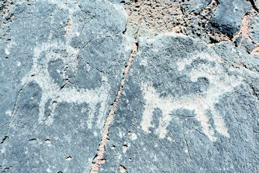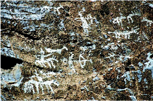 肅北縣大黑溝巖畫是全國重點文物保護單位,巖畫形成時間初步斷定在春秋、戰(zhàn)國至西漢時期,位于肅北縣城東約40公里處的大黑溝。巖畫共有34組,圖案190多幅,零亂分布在3.5公里長的山溝中,畫面內容多為射獵、放牧、練武、乘馬作戰(zhàn)等場景和北山羊、野牛、野駱駝等動物,畫面表現形式多以凹刻和凸刻,巖畫大多刻在避風向陽的陡峭花崗巖和石灰石上。