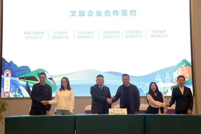 專題推介會(huì)上,平?jīng)鍪形幕瘡V電和旅游局推介了全市文旅資源及“引客入平”系列支持政策,崆峒山、大云寺·王母宮、龍泉寺、云崖寺等重點(diǎn)景區(qū)和涇川橙香瑤池溫泉酒店分別作了主題推介。平?jīng)鑫穆猛豆九c西安一帶一路文旅公司、涇川大云恒盛旅游公司與西安黃河國(guó)旅、崇信公劉文旅投公司與寶雞春暉旅行社、莊浪關(guān)山文旅投公司與寧夏新文化國(guó)旅、崆峒山國(guó)旅與重慶新旅程國(guó)旅、甘肅蘭神國(guó)旅平?jīng)龇止九c寧夏港中國(guó)旅、平?jīng)雎糜伟偈峦ㄅc西安金橋國(guó)旅等14家省內(nèi)外旅行社分別簽訂“引客入平”客源互送合作協(xié)議。推介環(huán)節(jié)還進(jìn)行了《神仙留戀的好地方》《崆峒武術(shù)魂》《折柳》和《春天的芭蕾》等文藝表演,與會(huì)嘉賓參觀了“問道崆峒·養(yǎng)生平?jīng)?rdquo;文旅形象圖片展、文旅產(chǎn)品市集、非遺技藝展示及網(wǎng)絡(luò)直播和非遺文創(chuàng)產(chǎn)品展。甘肅省文旅廳有關(guān)處室、各相關(guān)市州文旅部門負(fù)責(zé)人和省內(nèi)外旅行商、文旅企業(yè)、媒體記者代表,平?jīng)鍪兄攸c(diǎn)景區(qū)、文旅投公司、文創(chuàng)企業(yè)代表共150余人參加。