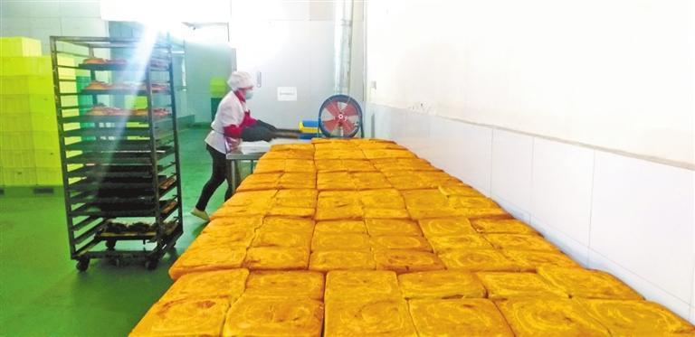 “揉面、搟面、抹餡料……”手工制作線上一位大姐告訴記者:“目前我們有手工生產(chǎn)和全自動(dòng)生產(chǎn)兩條線,分別生產(chǎn)千層餅傳統(tǒng)面點(diǎn)和玫瑰餅等新型糕點(diǎn)。傳承祖上燒餅制作技藝,工人們要在前一晚和好面,面團(tuán)經(jīng)過(guò)一夜的醒發(fā)后,天剛亮再交由經(jīng)驗(yàn)老到的師傅打堿,揉面、搟面,涂抹苦水玫瑰醬、胡麻顆粒、香豆粉、姜黃粉等餡料,卷制成型,在千層餅正面撒上芝麻,就可以上烤箱了,大約每天上午10點(diǎn)前烘烤好的千層餅會(huì)送往永登各銷售點(diǎn)。”