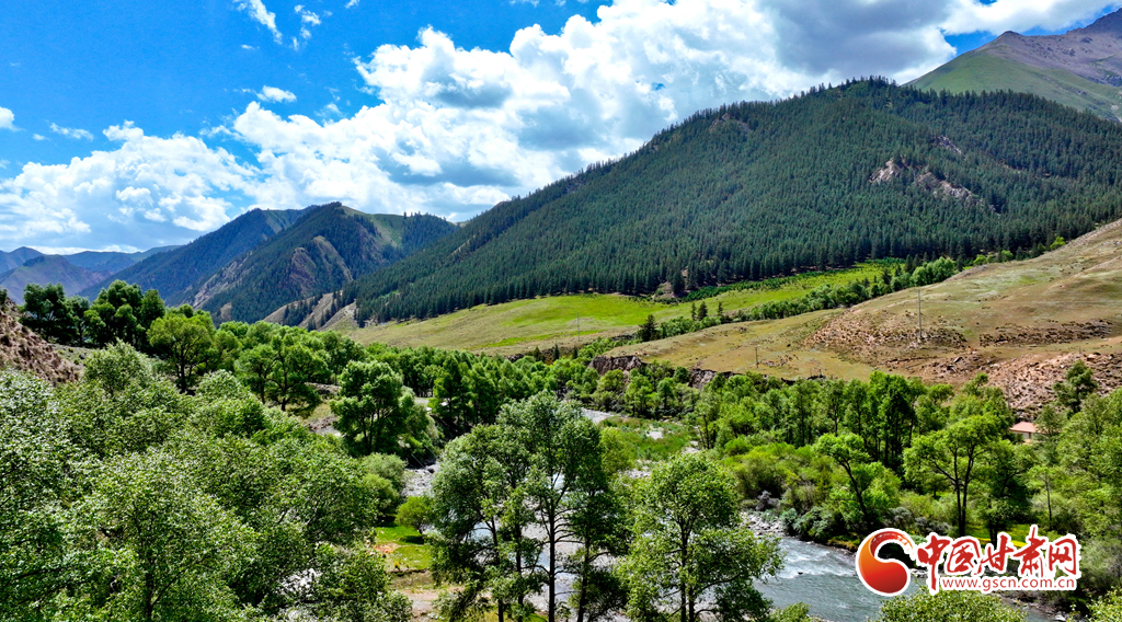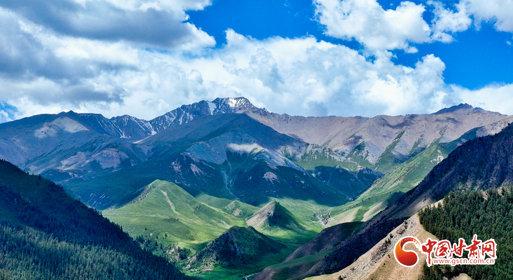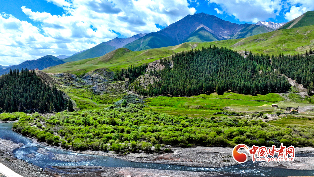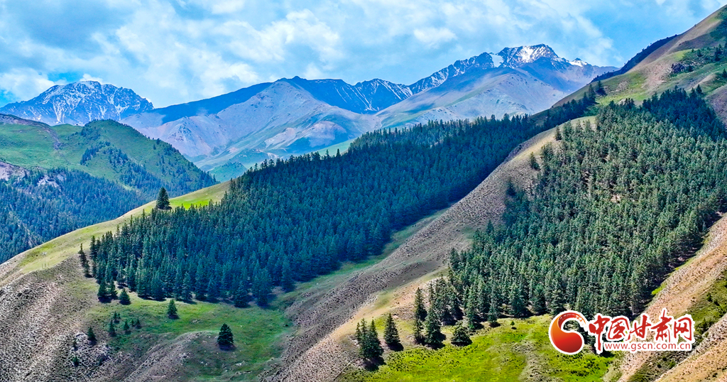 6月29日,在祁連山國(guó)家公園甘肅省張掖市肅南裕固族自治縣大河鄉(xiāng)段,藍(lán)天白云下,巍峨壯麗的祁連山蒼松翠柏,水光粼粼,構(gòu)成一幅美麗的畫(huà)卷。