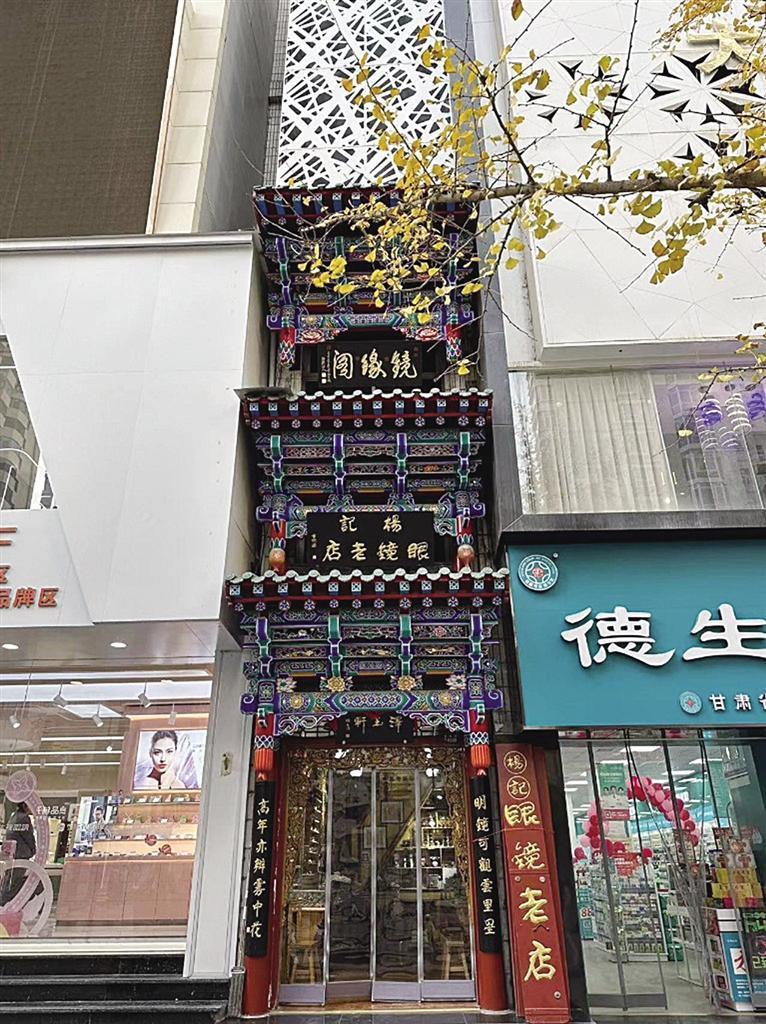 榫卯鑲嵌、手工木雕、精致彩繪、金箔貼邊,在張掖路步行街上,楊記眼鏡行的門樓招牌格外亮眼,雖然只有三四米寬的窄小門面,但店外從上而下的三塊古韻招牌彰顯出這家店的“不簡單”。“最下面這塊‘澤玉軒’的招牌是我家祖輩楊澤玉開創(chuàng)這家眼鏡行時留下的字號”,楊記眼鏡行是蘭州一家老字號的石頭眼鏡售賣和維修小店,光是制作修理石頭眼鏡這項手藝就已經(jīng)傳到了第五代,其店鋪在二十世紀八九十年代就獲得過商務(wù)部的“中華老字號”認可。