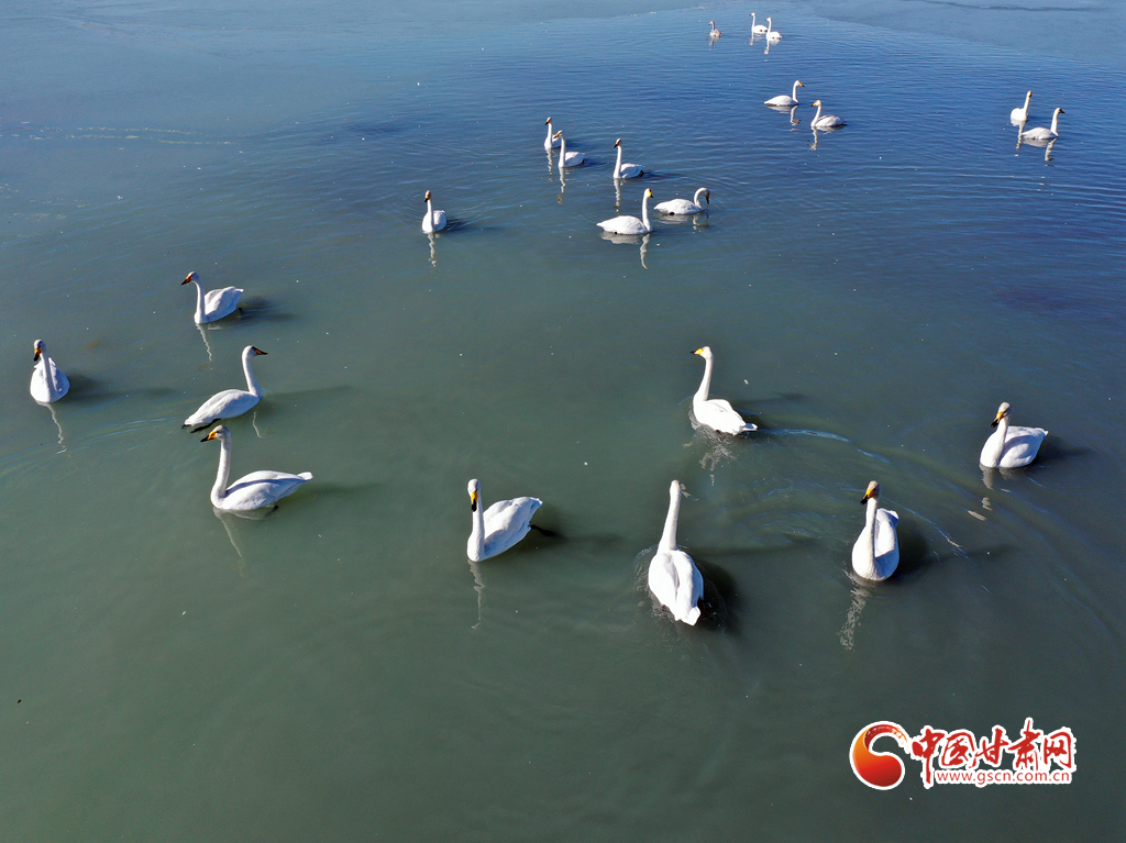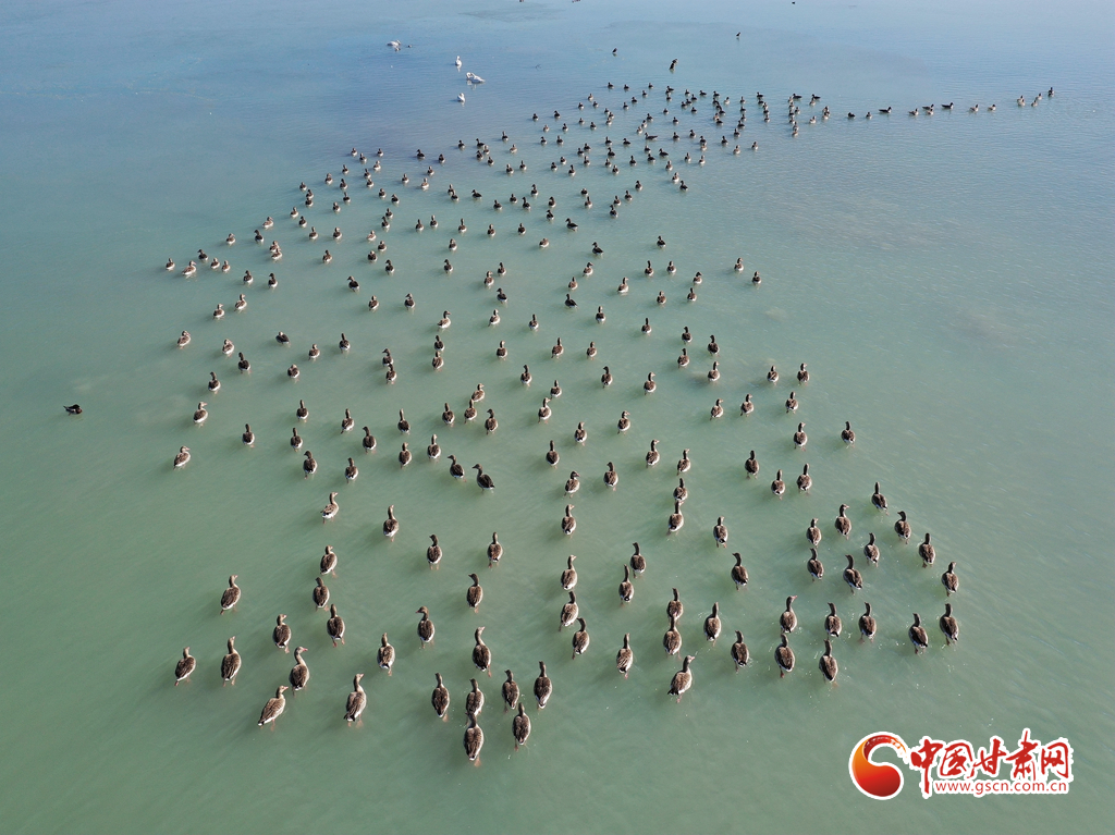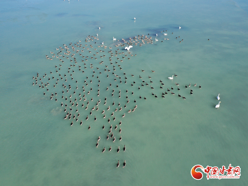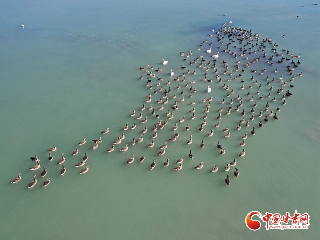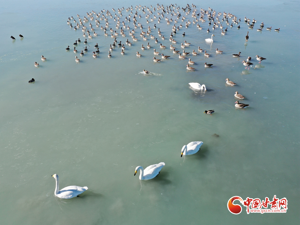 11月18日,在甘肅省張掖市臨澤縣新華農(nóng)場(chǎng)湖面上,眾多天鵝、灰雁和綠頭鴨等候鳥在此越冬棲息。