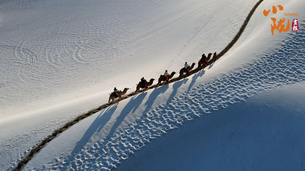 鳴沙山上,連綿不絕的沙海披上銀裝,放眼望去,如詩如畫,美不勝收,吸引了不少游客騎著駱駝踏雪賞景。