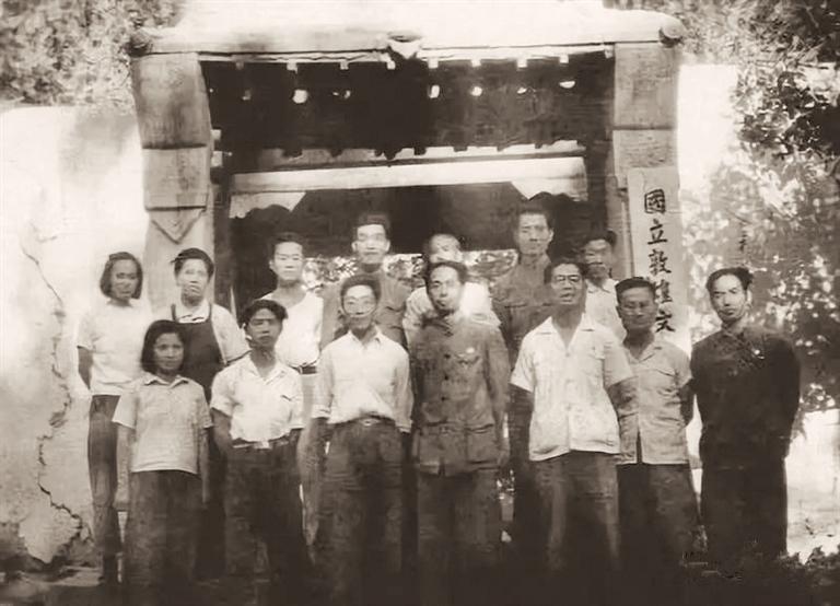 有一件事情在趙季平腦海里久久縈繞,難以忘懷。當(dāng)年,趙季平的父親、著名畫家趙望云曾有兩次不平凡的敦煌之行,但時隔多年,隨著時間的推移,他多次尋找父親敦煌之行的資料都未能如愿。這次在敦煌采風(fēng),趙季平又托朋友多方打聽,希望能幫助他尋找到那段難以釋懷的歷史。原敦煌市政協(xié)副主席高德祥先生多方努力,幾經(jīng)周折,終于在敦煌研究院的歷史檔案中發(fā)現(xiàn)了唯一一張照片:是趙望云代表人民政府接收國立敦煌藝術(shù)研究所時,與張明坦、常書鴻、段文杰、李承仙、范文藻、孫儒僴等人在研究所大門前的合影。高德祥囑托好友韓蘭魁先生將照片帶給了趙季平。