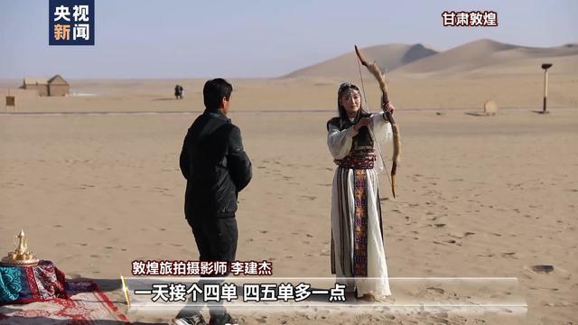 敦煌旅拍攝影師 李建杰:游客量變化還是挺大的,往年沒有這么多人。我作為一個攝影師,一天接四單,四五單多一點。