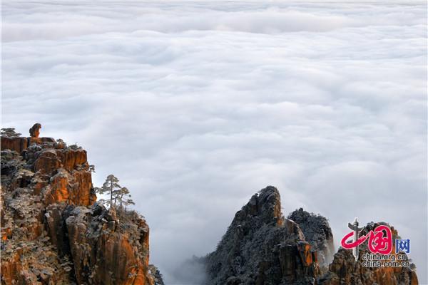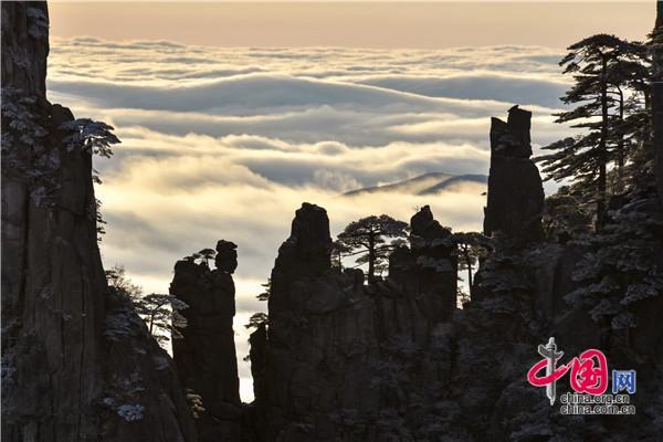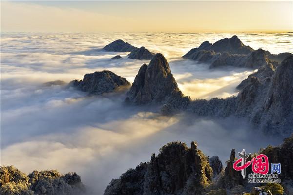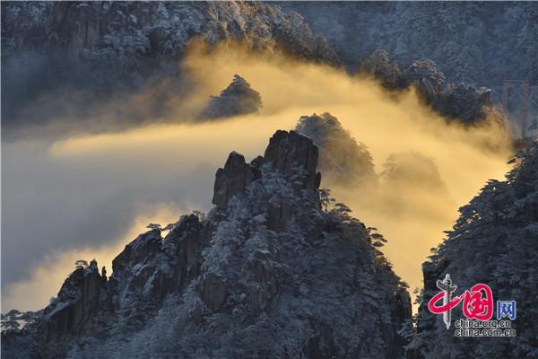 冬天的黃山絕美之處莫不過于雪景、霧凇、日出、云海同時(shí)出現(xiàn),1月5日雪后早晨一輪紅日冉冉升起,在陽光的照耀下,放射出萬丈光芒,在群峰間、奇松怪石上散發(fā)著金燦燦的光彩,給冬景增添神奇的色彩,美輪美奐宛如油畫。