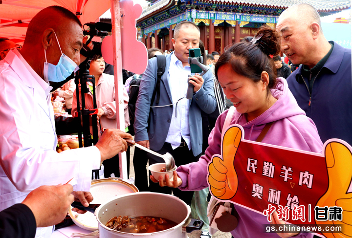 3月下旬,民勤縣在天水啟漢樓廣場舉行推介會,宣傳本地旅游資源和農(nóng)特優(yōu)產(chǎn)品。圖為游客一邊品嘗民勤羊肉,一邊聆聽美食背后的文化和故事。 周旦 攝