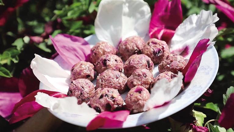 牡丹花肉丸,鮮香軟糯,做法不難。采摘新鮮的牡丹花,取花瓣用清水洗凈,選取肥瘦相間的羊肉剁成肉泥,和入切碎的牡丹花瓣,加入適量調(diào)料充分?jǐn)嚢枞嗄蟪赏枳樱b盤入鍋蒸20分鐘左右即可。熱氣騰騰的牡丹花肉丸,花香伴著肉香,由不得人大快朵頤。