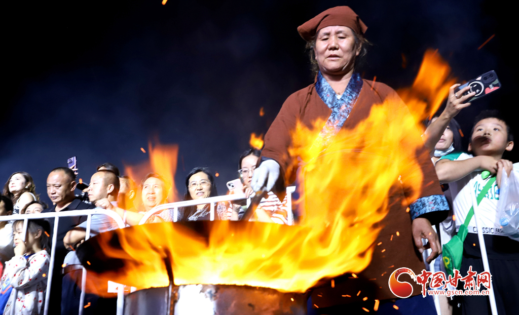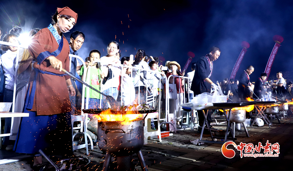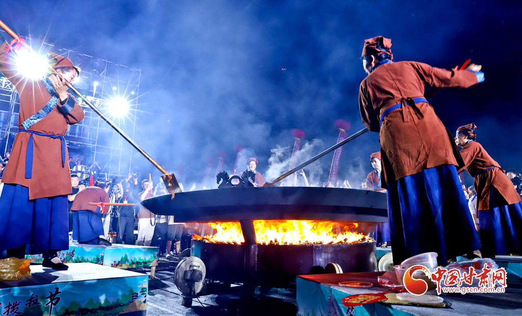 7月13日晚,甘肅省張掖市山丹縣智行廣場上, 一口直徑3.3米的大鏊展現在廣場中央,八名大廚揮動著鏟子奮力翻炒,將一碗碗絲路美食炒撥拉呈現在眾多游客面前。