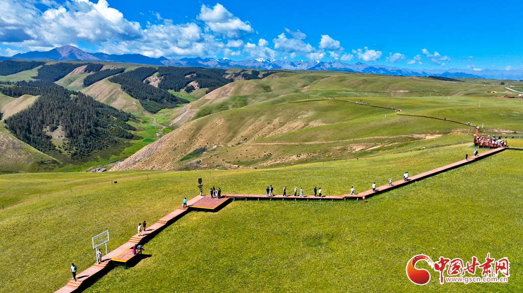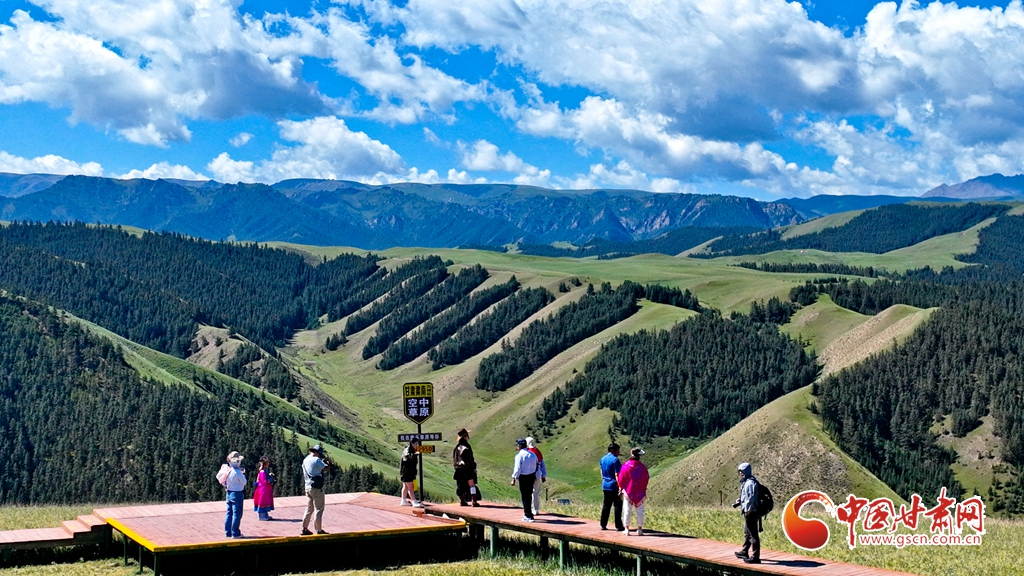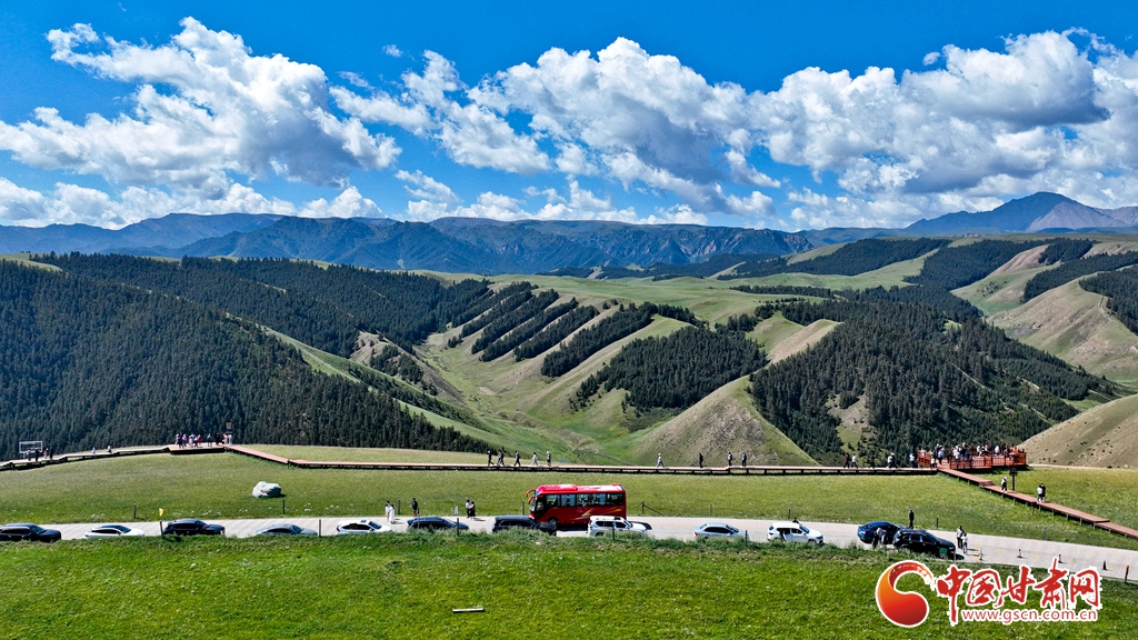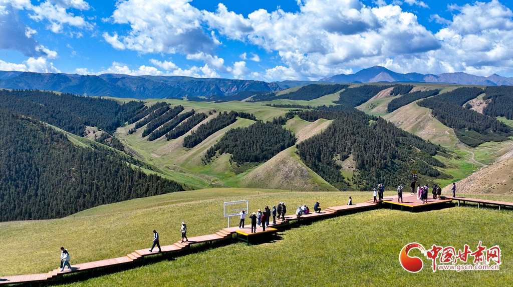 8月3日,祁連山國家公園甘肅省張掖市肅南裕固族自治縣康樂草原段迎來一年最美時(shí)光,游客在藍(lán)天、白云、森林、草原融為一體的旖旎風(fēng)光中拍照留念。