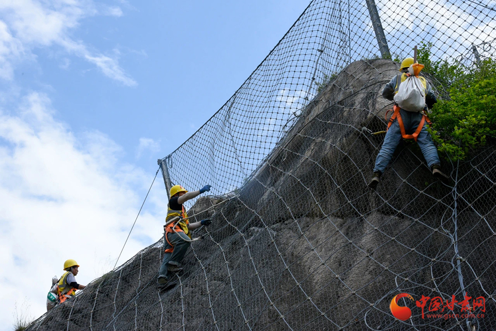 近日,隴海鐵路魏家磨1號隧道上方的山體上,蘭州鐵路局定西工務(wù)段新陽鎮(zhèn)橋路養(yǎng)修工區(qū)的作業(yè)人員,一手抓安全繩,一手拿檢查錘,攀附在懸崖峭壁上仔細排查防護網(wǎng)內(nèi)危石情況,及時消除落石隱患。