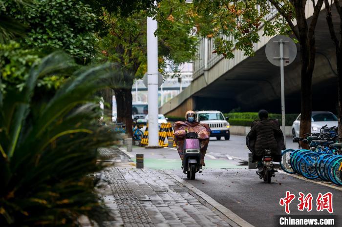 11月25日,市民在街頭出行。當(dāng)日,武漢受寒潮天氣影響,氣溫下降明顯。武漢市氣象臺24日18時27分發(fā)布寒潮藍(lán)色預(yù)警信號,受較強(qiáng)冷空氣影響,預(yù)計24日至26日,武漢最低氣溫降幅達(dá)7℃~9℃。中新社記者 張暢 攝