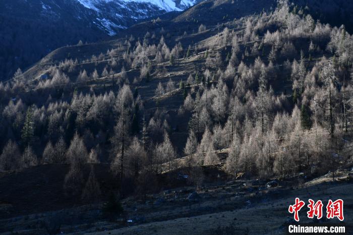 12月2日,四川省阿壩州小金縣四姑娘山雙橋溝植被夕陽照射,形成一幅美麗畫卷。中新社記者 張浪 攝
