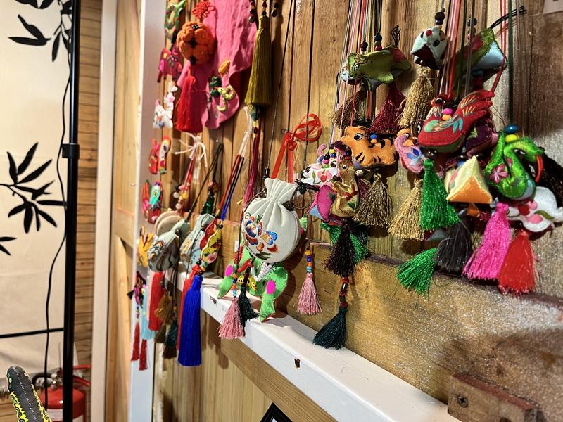 (法國巴黎圣誕集市慶陽香包展位上懸掛的各式各樣香包。)
