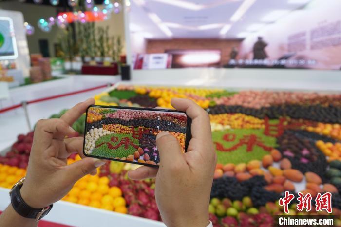 2022年7月10日,第二十八屆中國(guó)蘭州投資貿(mào)易洽談會(huì)展區(qū)展示甘肅地方特色產(chǎn)品。圖為參觀者手機(jī)拍攝用農(nóng)產(chǎn)品拼裝的“甘味”。(資料圖)九美旦增 攝