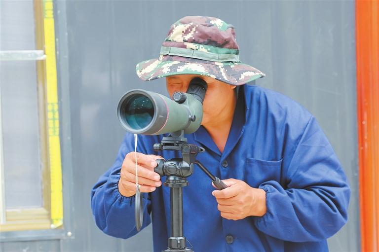 宋治平通過單筒望遠鏡觀察朱鹮。 新甘肅·甘肅日報記者 馮樂凱