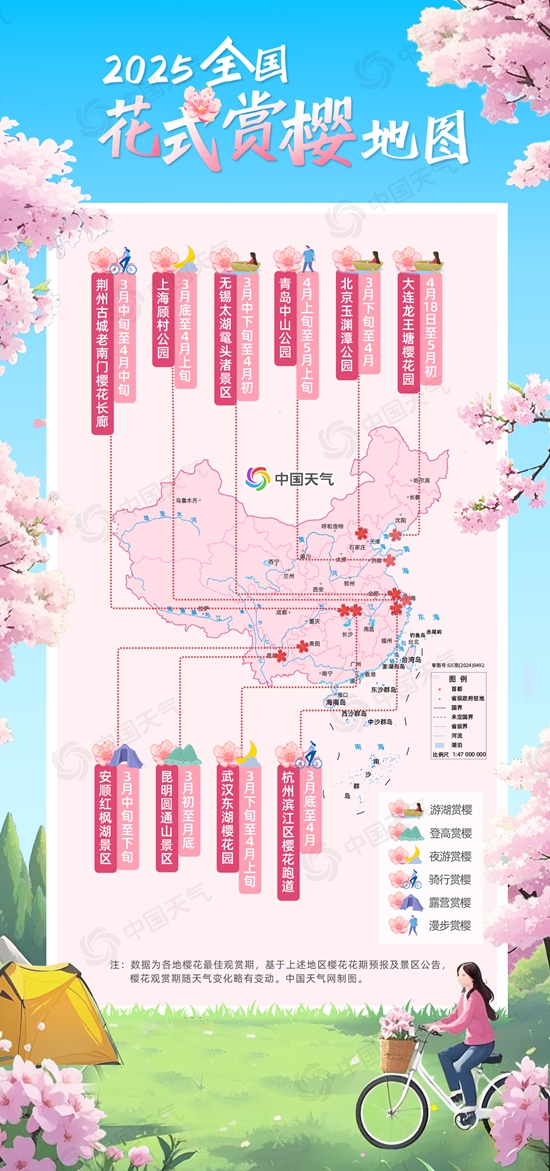 “櫻花紅陌上,柳葉綠池邊。”又是一年櫻花季!今年3月中下旬以來(lái),我國(guó)大部經(jīng)歷了大回暖,催動(dòng)春花盛放,目前武漢、南京等地櫻花已進(jìn)入盛花期,北方多地櫻花也開始迎來(lái)觀賞期。中國(guó)天氣網(wǎng)特別推出2025全國(guó)花式賞櫻地圖,盤點(diǎn)十大賞櫻勝地最佳觀賞期和花式玩法,快來(lái)開啟你的賞櫻之旅吧。
