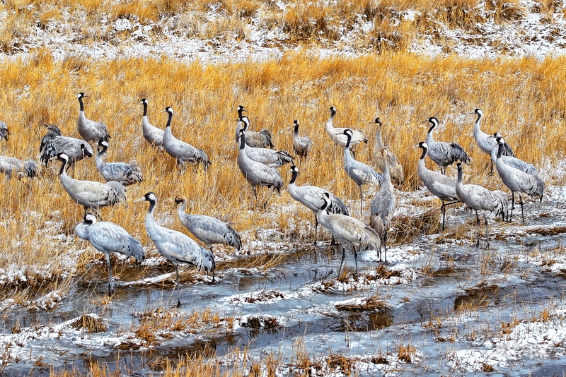 在嘉峪關(guān)草湖國家濕地公園休整的灰鶴(央廣網(wǎng)發(fā) 嘉峪關(guān)市融媒體中心供圖)