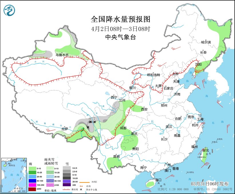 3月31日08時(shí)至4月1日08時(shí),內(nèi)蒙古東北部、黑龍江西北部和東部、吉林東部、新疆沿天山地區(qū)、西藏東部、青海南部、川西高原北部等地部分地區(qū)有小到中雪或雨夾雪,其中,川西高原北部等地部分地區(qū)有大雪(5~9毫米)。西藏東南部、西南地區(qū)東部、江南南部和東部、華南中東部、臺(tái)灣島等地部分地區(qū)有小到中雨,其中,臺(tái)灣島北部等地部分地區(qū)有大到暴雨(50~70毫米)。西藏南部、青海西部、內(nèi)蒙古東部、遼寧中南部、山東半島、浙江東部等地部分地區(qū)有4~6級(jí)風(fēng),西藏東部部分地區(qū)有8~9級(jí)風(fēng);渤海、渤海海峽、黃海北部、東海大部、臺(tái)灣海峽、臺(tái)灣以東洋面、巴士海峽、南海中北部海域有6~7級(jí)風(fēng),陣風(fēng)8級(jí)。