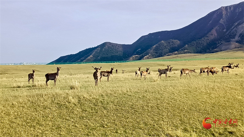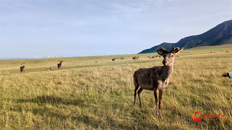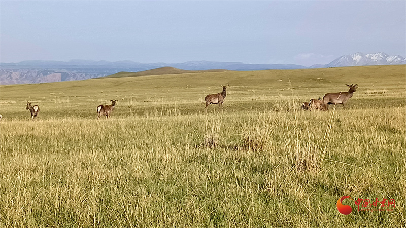 初夏的肅南大河草原牧草逐漸返青,一群群馬鹿在草原上悠閑覓食,游客到來并沒有打擾它們的正?;顒?。