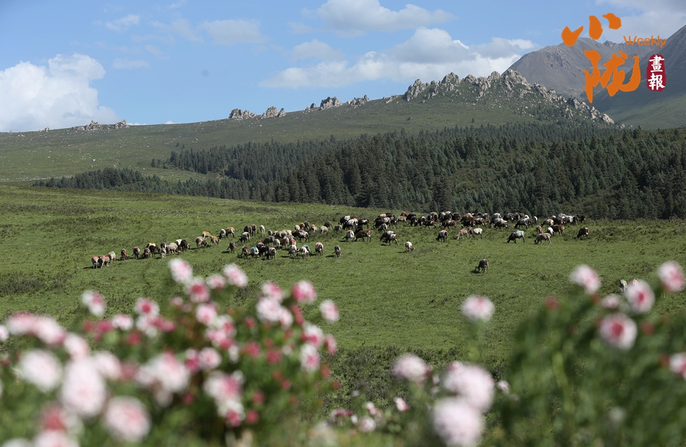祁連下的康樂草原,是肅南裕固族人生活的地方。這里風(fēng)光秀美,山地高原交相呼應(yīng),丘陵漫甸連綿起伏。放眼周圍,遠處祁連山巍峨挺拔,近處樹木郁郁蔥蔥,優(yōu)美壯觀。
