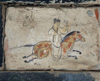 它的“不一般”,首先在于其“極簡(jiǎn)卻傳神”的藝術(shù)風(fēng)格。該磚的畫(huà)面以赭石色為底,墨線寥寥,卻生動(dòng)勾勒出一位策馬疾馳的驛使:頭戴魏晉幘帽,身著右衽短衫,左手控韁,右手舉著文書(shū)。而駿馬則四蹄騰空,動(dòng)態(tài)感十足,一種風(fēng)馳電掣的緊迫感似從畫(huà)中撲面而來(lái)。更耐人尋味的是,畫(huà)師刻意省略了驛使的嘴巴:這一“殘缺”設(shè)計(jì),并非疏忽,而是古人智慧的體現(xiàn),象征著郵驛制度中“守口如瓶”的保密原則,使其成為中國(guó)古代信息保密文化的生動(dòng)見(jiàn)證。